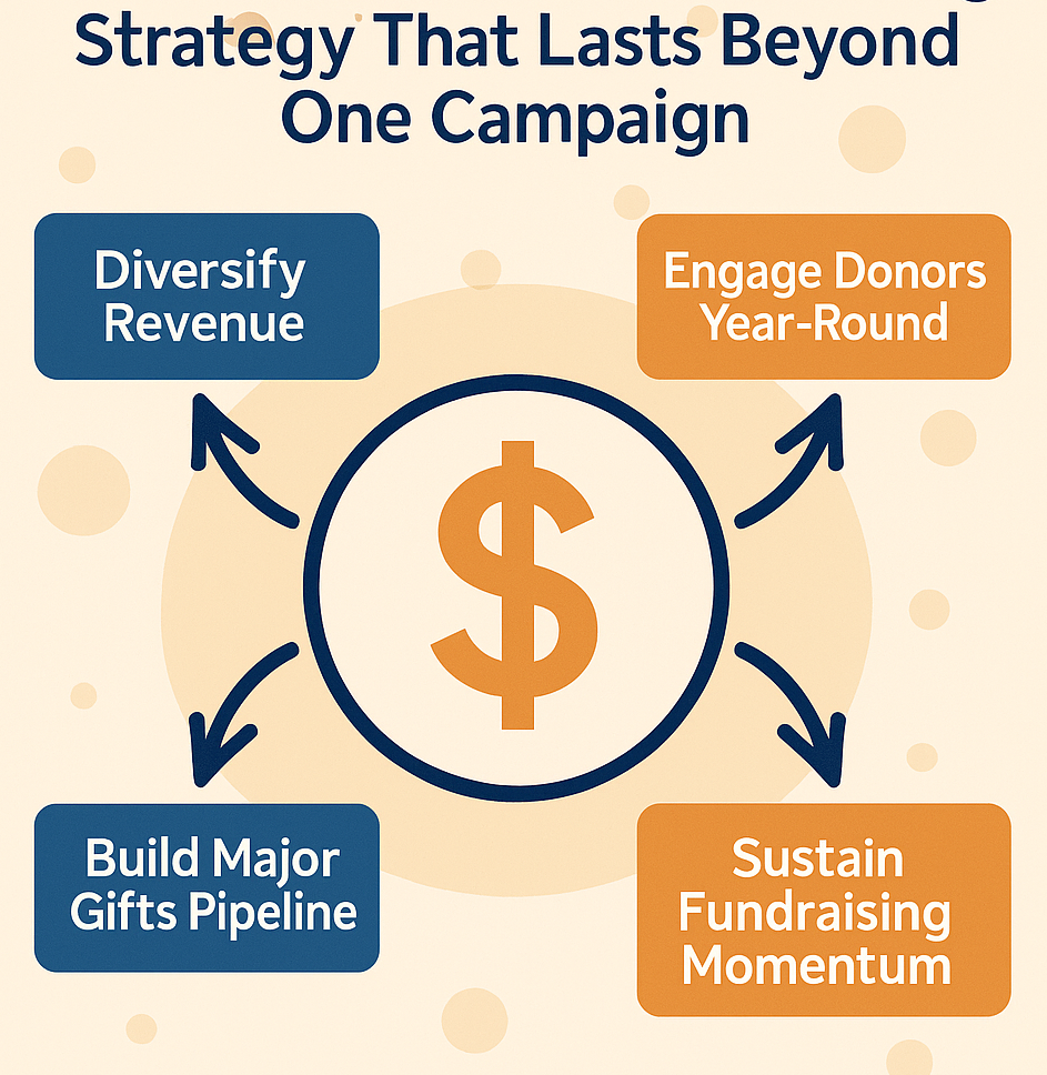 Steps to build sustainability: diversify revenue, engage donors year-round, build a major gifts pipeline.